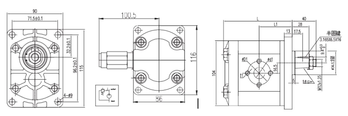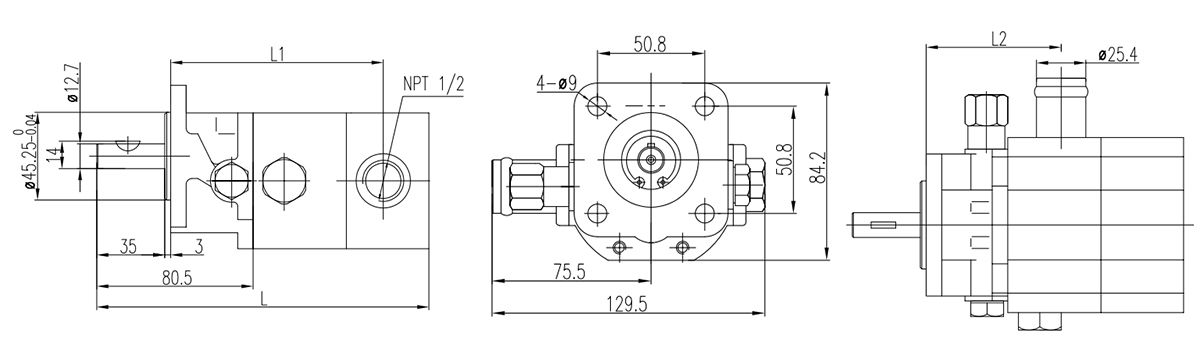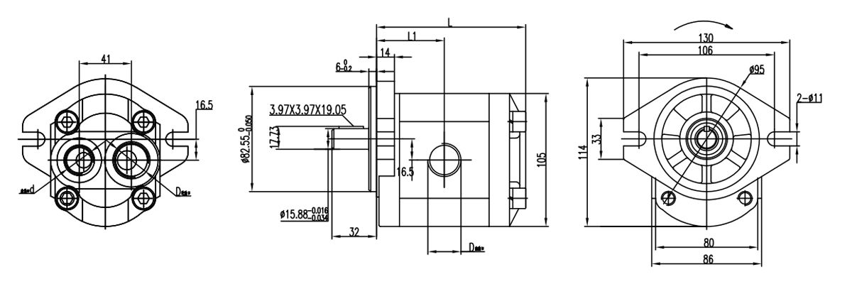| Model | Displacement (ml/r) | Pressure (bar) | Speed (r/min) | L | L1 | Inlet port | Outlet port | |||||||
